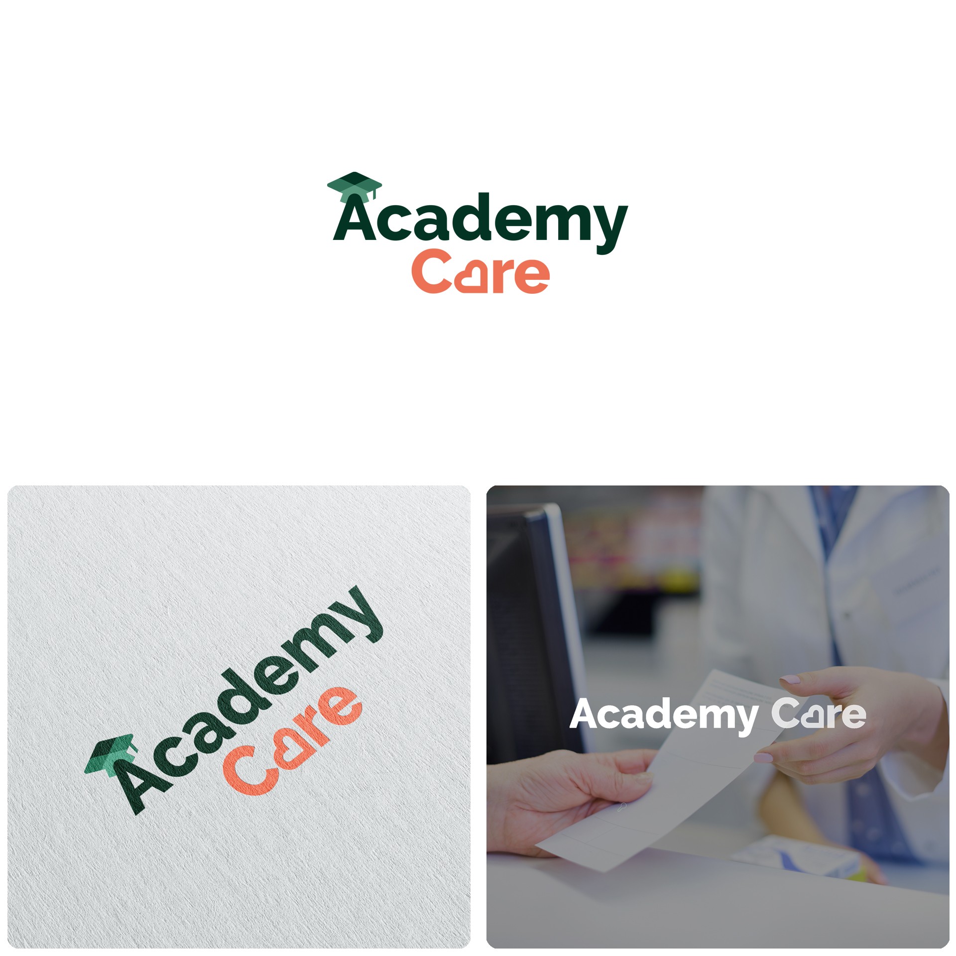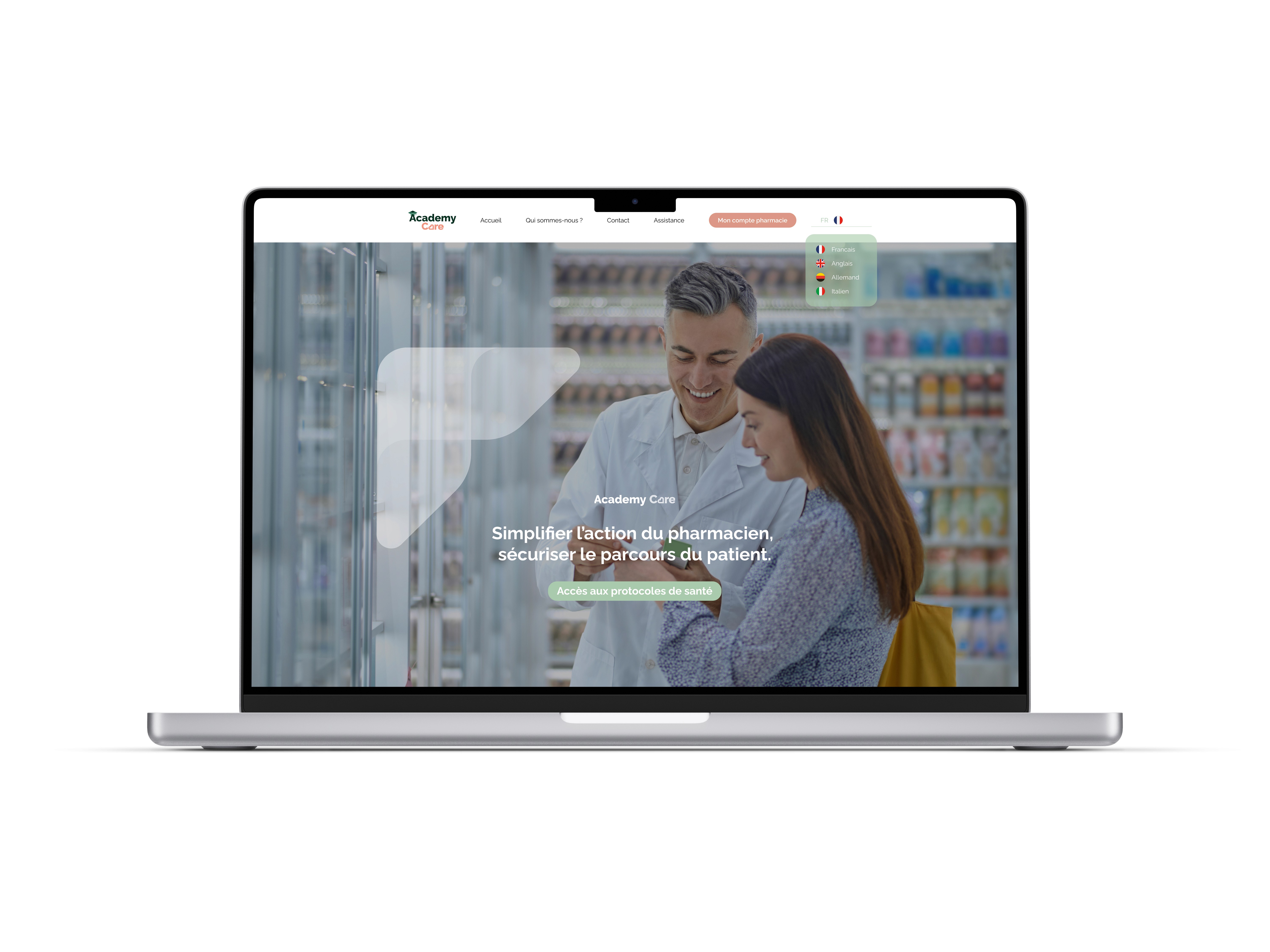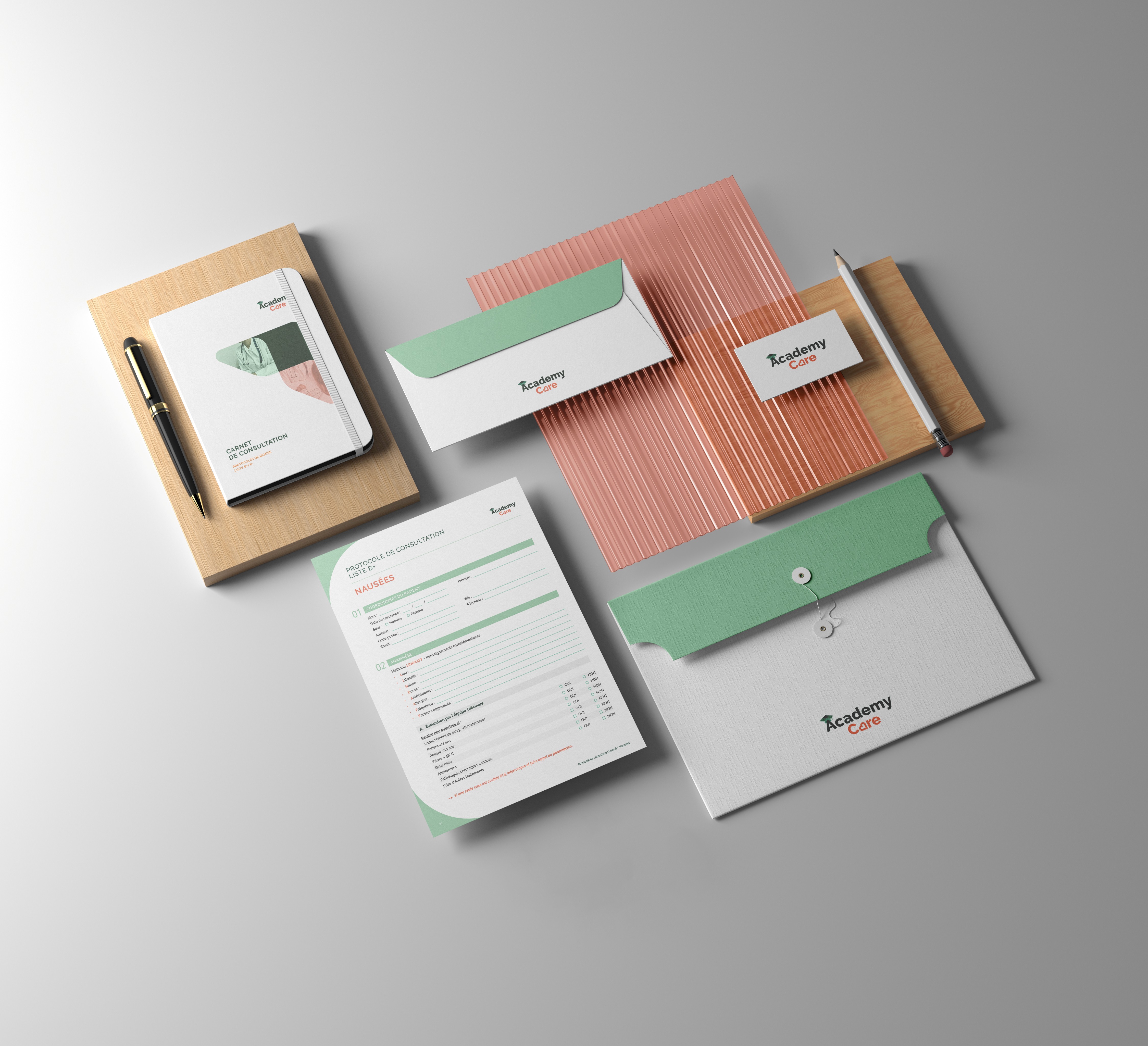 Pour la plateforme Academy Care, spécialisée dans les protocoles de santé à destination des pharmaciens, nous avons créé l'identité visuelle complète de la marque : logo, charte graphique et déclinaisons sur supports print. Le design allie rigueur médicale et accessibilité visuelle, avec une palette verte et orange pensée pour refléter à la fois le soin et la pédagogie.
